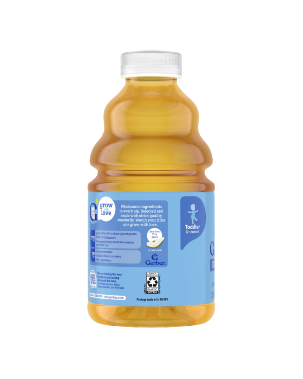 Gerber 100% Pear Juice for Toddlers 12+ Months is 100% juice with no added sugar, artificial flavors, or colors. Non-GMO, fortified with Vitamin C, and toddler-friendly for everyday sipping.