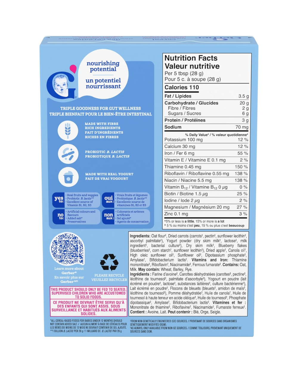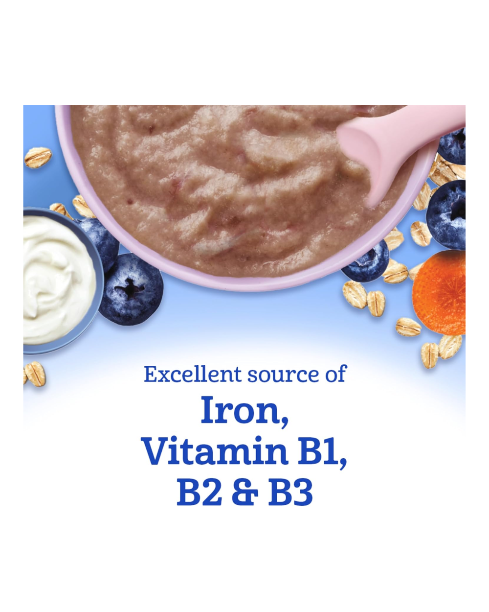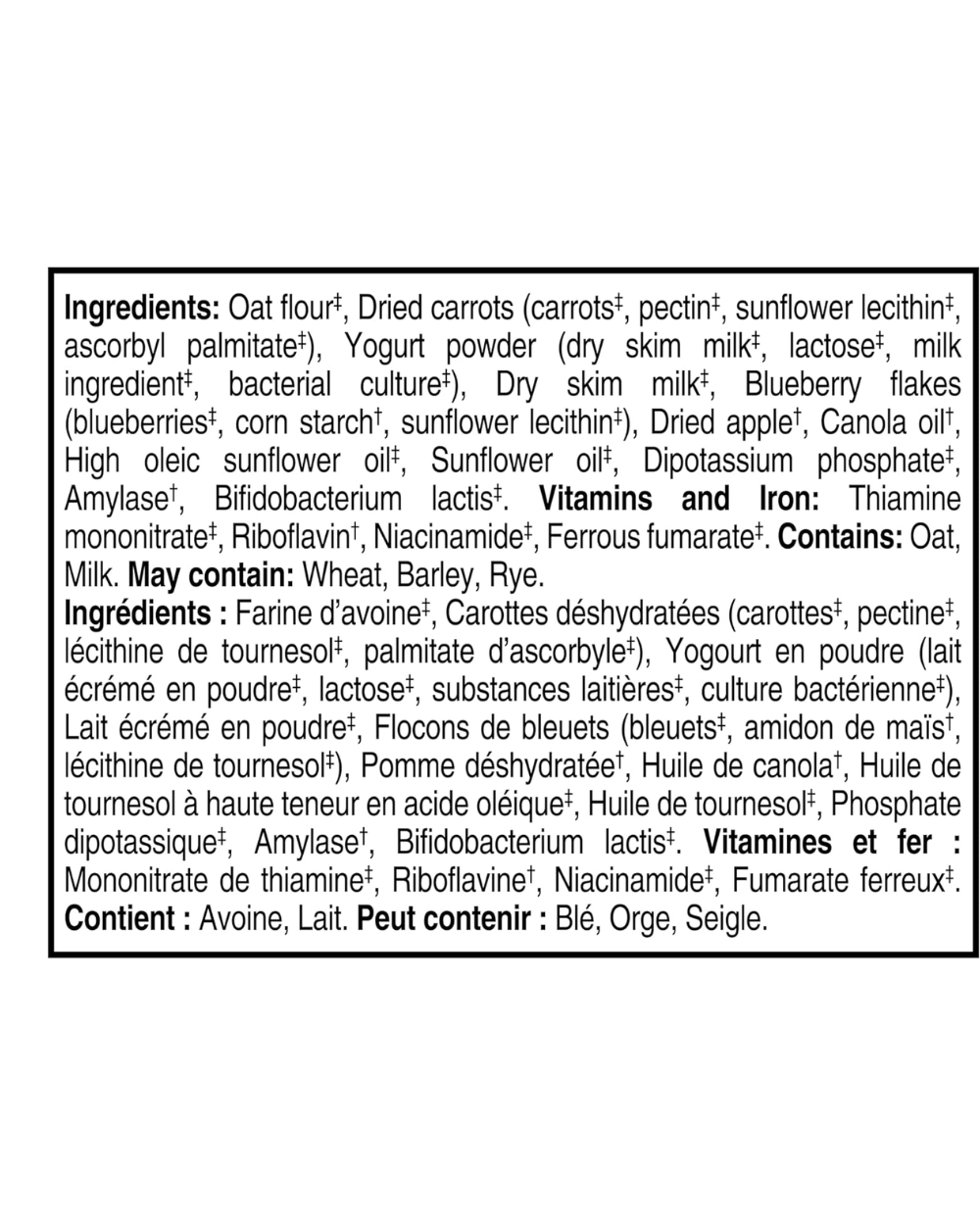Whole grain oats, dried yogurt, blueberry puree, carrot puree, milk powder, Probiotic B. Lactis, vitamins (B1, B2, B3), minerals, fibre blend.