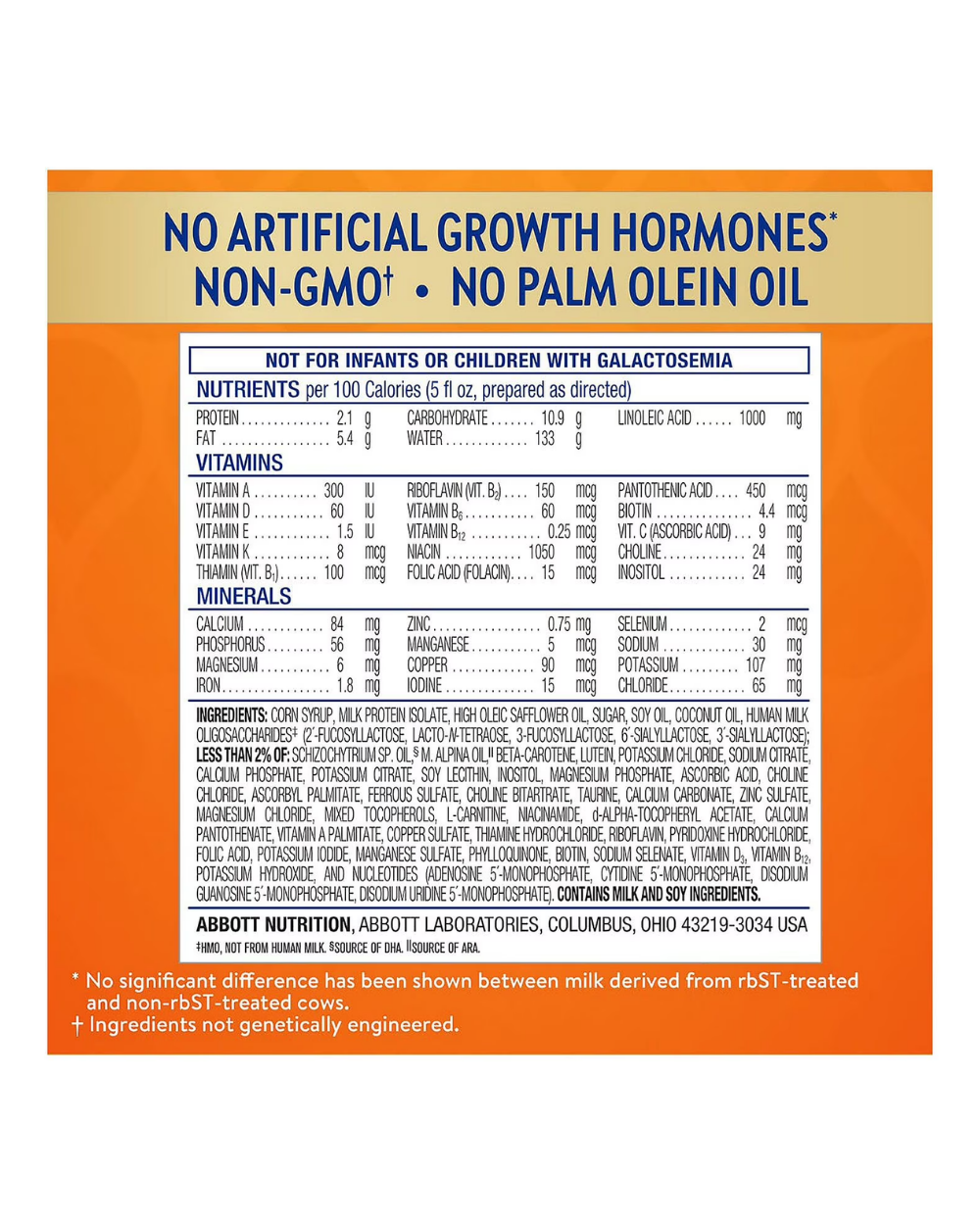 Corn syrup solids, milk protein isolate, high oleic safflower oil, soy oil, coconut oil, lactose, 2’-FL HMO, LNnT HMO, 3-FL HMO, 6’-SL HMO, DHA, lutein, vitamins, minerals